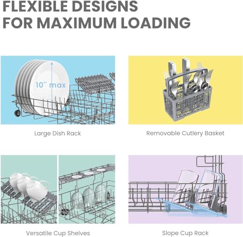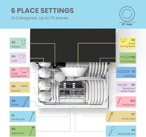6 Place Setting- A perfect size (H17.2″×W21.6″×D19.7″) for 2-3 people, COMFEE’ compact dishwasher is suitable for dorms, RVs, and apartments. This countertop dishwasher can fit up to 70 pieces of tableware and has a plate size of up to 10 inches in diameter. Note: COMFEE dishwashers are tested at the factory before they are shipped. If your new dishwasher has some water inside, this is normal.