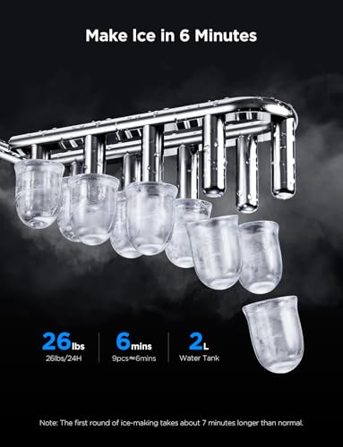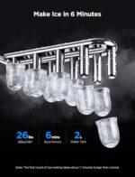 Rapid Ice Making: With GoveeLife Smart Countertop Ice Maker, enjoy nine refreshing bullet ice cubes in just 6 minutes. A 2L water tank allows for up to 26 pounds of ice to be produced every 24 hours, offering ice as and when you need it.