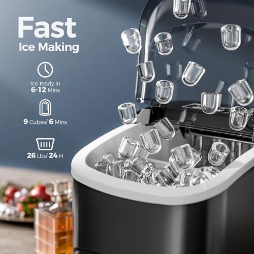 【Efficient Ice Production】Never run out of ice again! Countertop ice maker produces 9 ice cubes within only 6 minutes.It even can produce up to 26 pounds of ice per day, ensuring you’re always prepared for a party, family gathering, or simply enjoying a cold drink on a hot day.